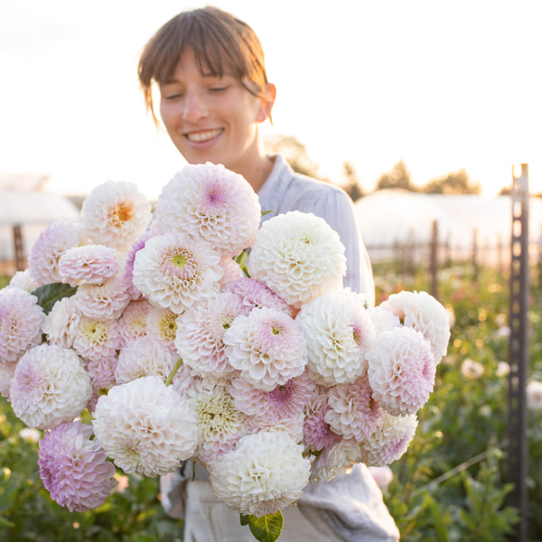 Le produit le plus vendu de la ferme, adoré par toutes les mariées, il s'intègre parfaitement dans les arrangements. Des fleurs de taille géante avec une douce nuance de couleur poudrée, par endroits rosée. Il n'y a pas de couleur plus délicate dans le champ de dahlias.
