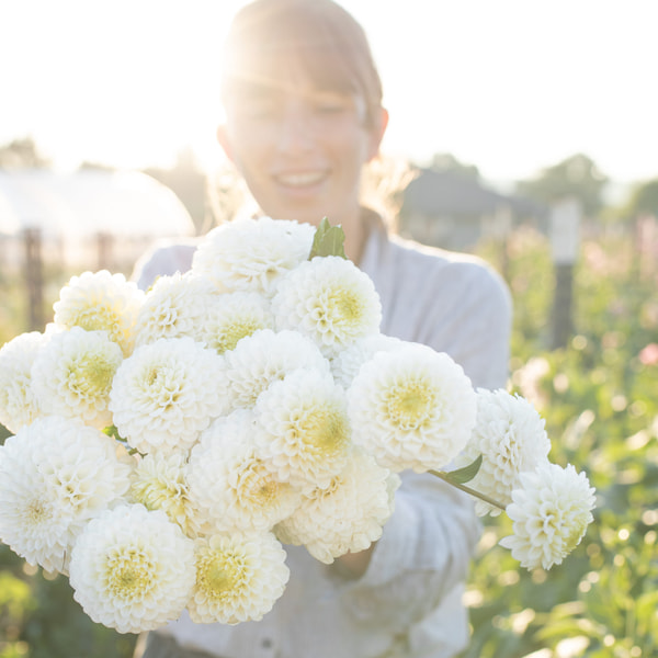 Le produit le plus vendu de la ferme, adoré par toutes les mariées, il s'intègre parfaitement dans les arrangements. Des fleurs de taille géante avec une douce nuance de couleur poudrée, par endroits rosée. Il n'y a pas de couleur plus délicate dans le champ de dahlias.