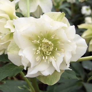 Les hellébores sont des vivaces à feuillage persistant qui forment des touffes de feuilles coriaces vert foncé s'étendant lentement. Les tiges portent généralement quatre à cinq fleurs. Elles fleurissent très tôt, dès la fin de l'hiver et au début du printemps. Elles ne sont utilisables en vase qu'une fois que des capsules de graines bien visibles se sont formées au centre de la fleur et que la fleur a mûri. Auparavant, elles ont tendance à flétrir et les tiges ne maintiennent pas la fleur en position verticale. Toutes les parties de la plante sont toxiques. Double Ellen White est un hellébore à fleurs doubles presque blanc pur. Ses pétales sont légèrement ondulés et la rangée inférieure de pétales est légèrement teintée de vert.