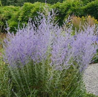 Les Perovskia sont des sous-arbrisseaux peu ramifiés, originaires de régions allant de l'Afghanistan au Tibet. Ils poussent sur des sites ouverts, ensoleillés, rocheux et pierreux. Leurs pousses feutrées de blanc et leurs feuilles aromatiques grisâtres sont remarquables. Ils conviennent aux parterres ensoleillés avec d'autres vivaces xérophiles, où ils créent des structures intéressantes même pendant les mois d'hiver. Blue Spire est une variété aromatique au feuillage gris-vert délicat et aux fleurs bleu moyen aérées et voyantes.