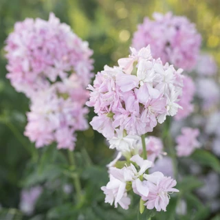 Le Phlox, ou plamenka en tchèque, est une plante vivace originaire d'Amérique du Nord. Il a rapidement gagné en popularité dans les jardins européens et fait l'objet d'une sélection systématique depuis le XIXe siècle. C'est une vivace classique pour les bouquets, où elle ravit non seulement par ses fleurs colorées, mais aussi par son parfum délicat. Récoltez dès qu'environ la moitié des fleurs de l'inflorescence sont épanouies ; elles tiennent alors jusqu'à 10 jours en vase. Malgré les efforts pour créer des cultivars aussi résistants que possible, le phlox reste extrêmement sensible au climat et aux conditions du sol ; nous veillons donc soigneusement au choix de l'emplacement. Nora Leight attire l'attention avec ses feuilles panachées de crème, qui complètent les fleurs blanc-rosé délicates à l'œil plus foncé. Grâce à son feuillage clair, elle peut illuminer les coins plus sombres du jardin.