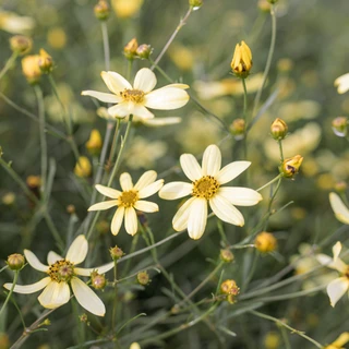 Une belle plante vivace délicate originaire d'Amérique du Nord. Les fleurs voyantes, assez grandes mais délicates, s'harmonisent magnifiquement avec le riche nuage vaporeux de petites feuilles. Elles forment des petits buissons compacts et sont idéales pour l'avant des parterres. Nous classons les Coréopsis parmi les vivaces à vie naturellement courte. Nous pouvons influencer partiellement leur longévité par le choix d'un emplacement approprié et les soins au cours de la saison. Le cultivar Moonbeam fleurit avec une grande quantité de fleurs jaune clair aux centres plus foncés. Il tient environ une semaine en vase.