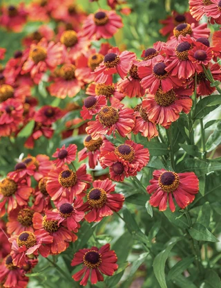 L'Hélénie est originaire d'Amérique du Nord, où on la trouve dans les prairies humides. Elle pousse de manière dressée et en touffes. Les inflorescences forment de petits « soleils » de 5 cm de diamètre. D'où leur nom scientifique Helenium. Une excellente vivace pour la coupe avec une longue tenue allant jusqu'à 14 jours. Helena Red Shades fleurit dans des tons allant du rouge au cuivré.